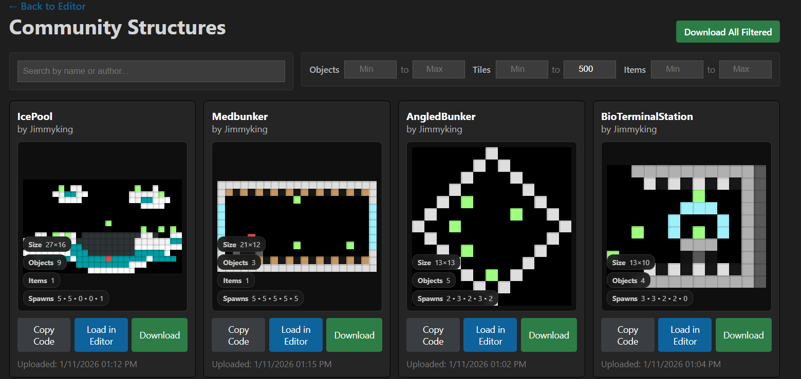 BepInEx/Plugins/Structures folder to see it in-game!Or, upload it onto the online structure browser by clicking on 'Upload' and giving it a name. Note that you cannot override or delete any content for safety reasons, so ensure you only put the final version out!